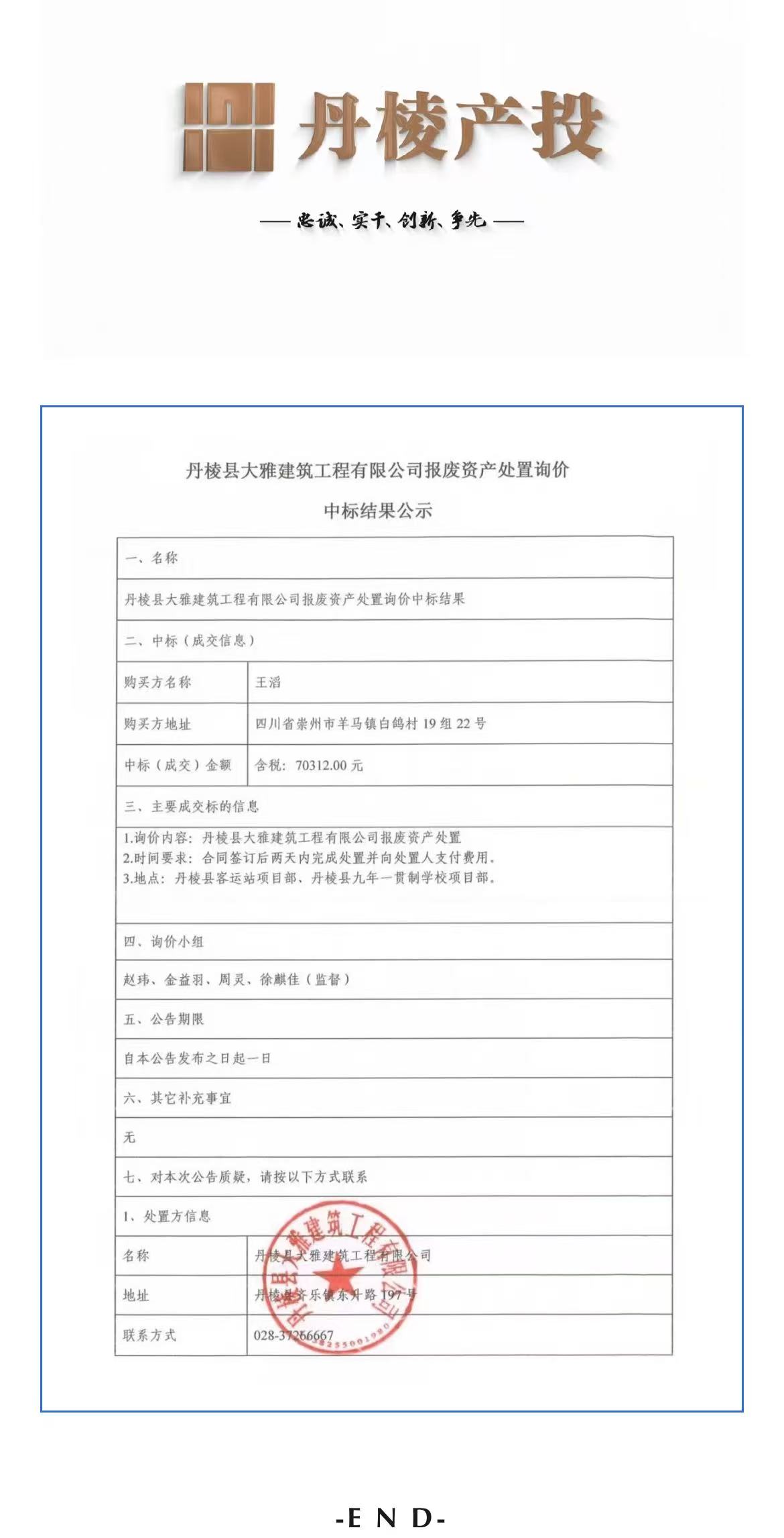 丹棱縣大雅建筑工程有限公司報廢資產處置詢價中標結果公示